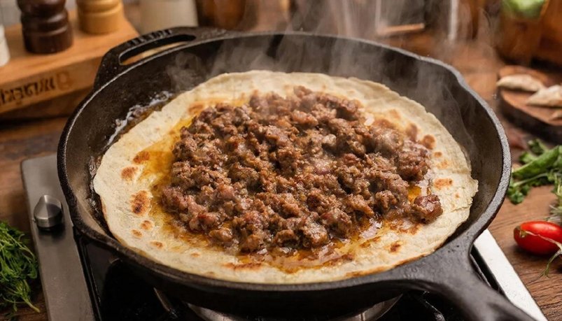 3. Разогрейте сковородку на растительном масле, положите лепёшку мясом вниз и обжаривайте в течение 5 минут на среднем огне. Затем переверните и в произвольном порядке положите остальную начинку. Через 3 минуты снимите с плиты.