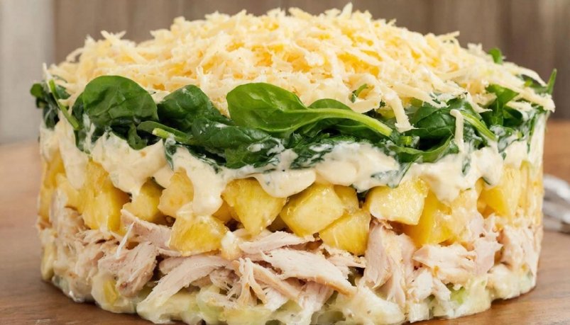 Вам понадобится: копченая куриная грудка, майонез, вареные яйца, чеснок, ананасы и твердый сыр.