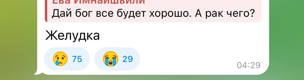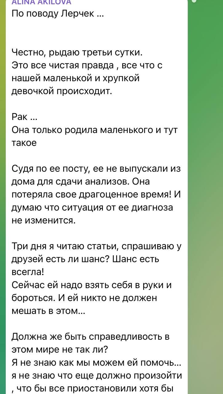 "Это все чистая правда — все, что с нашей маленькой и хрупкой девочкой происходит. Рак желудка четвертой стадии с метастазами. Судя по ее посту, ее не выпускали из дома для сдачи анализов. Она потеряла свое драгоценное время! И думаю, что ситуация от ее диагноза не изменится", — написала свое мнение Акилова.