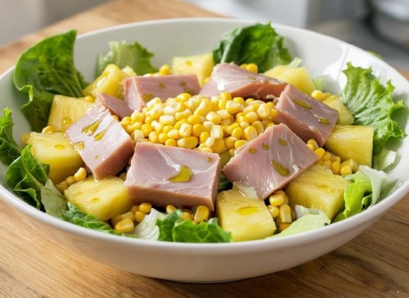 4. Перед подачей украсить зеленью и ломтиком ананаса.