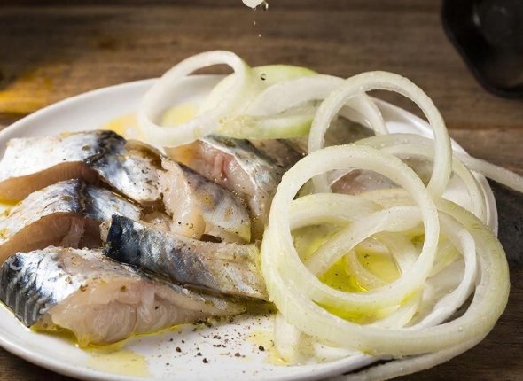 4. Лук — на полукольца. Возьмите миску и начните всё укладывать постепенно и слоями: лук, рыба и так далее. В конце — полить маслом. Накрыть снова крышкой и поставить в холодильник на 3 часа. Через время у вас на столе готовая закуска.