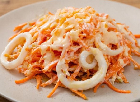 Вам понадобится: отварной кальмар и морковь по-корейски, специи, майонез или сметана на ваш выбор.