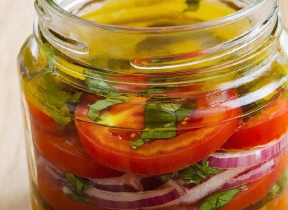 4. А теперь последний этап: в небольшую кастрюлю или банку положите овощи слоями — помидор, лук и чеснок. Пока все ингредиенты не закончатся. Сверху залейте все приготовленной заправкой.