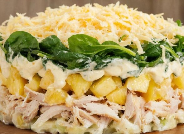 Вам понадобится: копченая куриная грудка, майонез, вареные яйца, чеснок, ананасы и твердый сыр.
