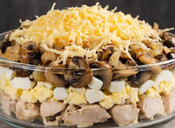 4. Выложите все ингредиенты слоями: курица, майонез, грибы вместе с луком, майонез, яйца, майонез и сверху сыр.